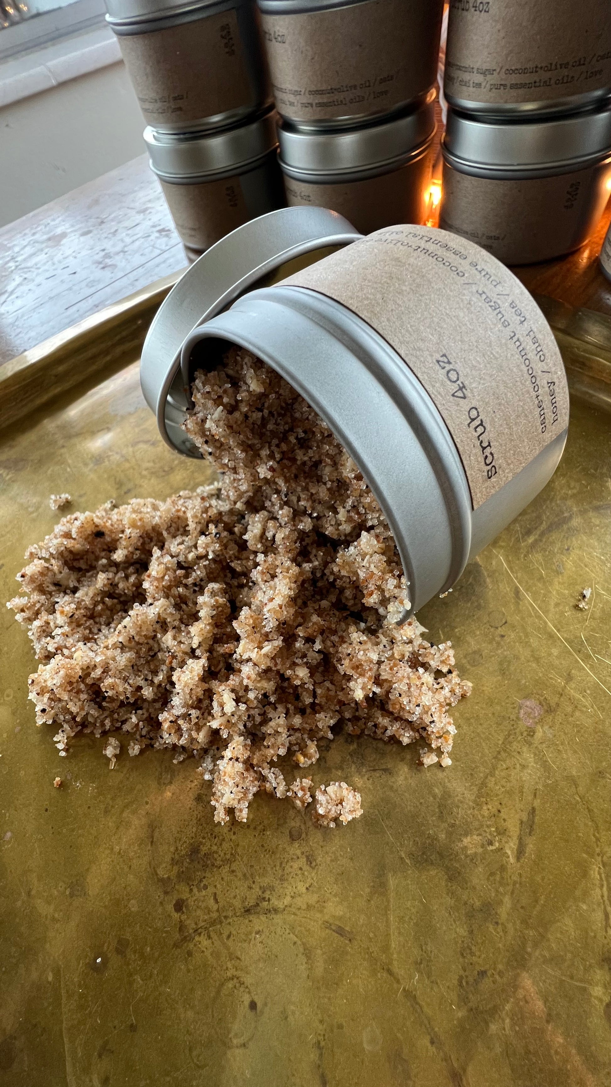 ingredients: cane/coconut sugars, coconut/olive oils, oats, honey, chai tea, pure essential oils, love.